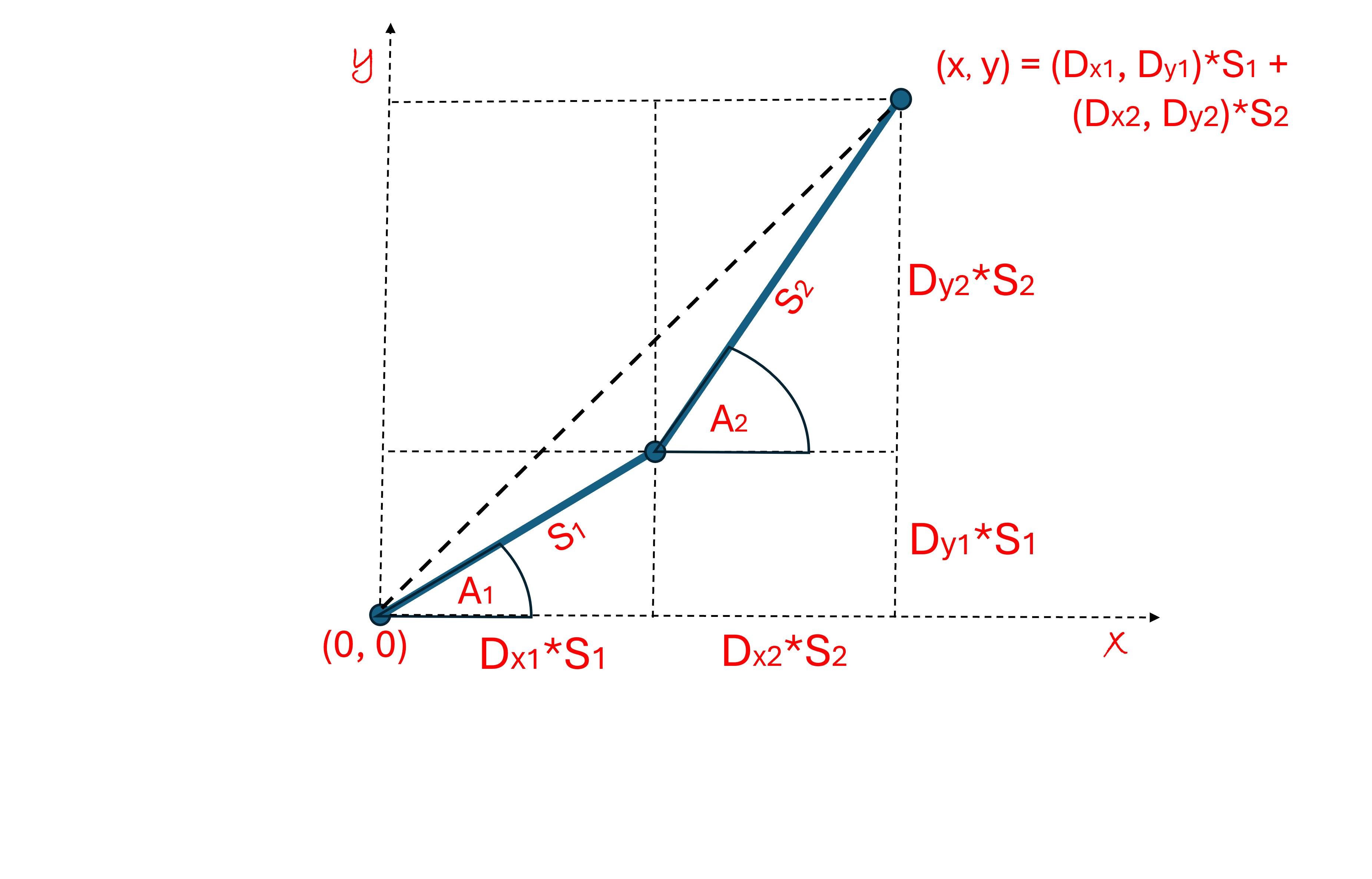 Which says that the point of our destination (x, y) can be found by going in the direction (Dx1, Dy1) for a distance (S1) and then going a direction (Dx2, Dy2) for a distance (S2). Notice that to find our destination (x, y), we just add these two vectors together. It is just like piecing together lines to form a path.