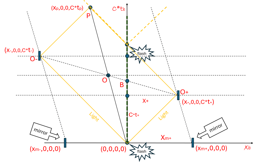 The events are labeled on the diagram, the flash is at the origin, light bounces off the mirror in the positive direction at ‘O+’ and simultaneously bounces of the mirror in the negative direction at ‘O–‘, ‘O’ is the midpoint between O+ and O–, and ‘P’ is when the light comes back to center.