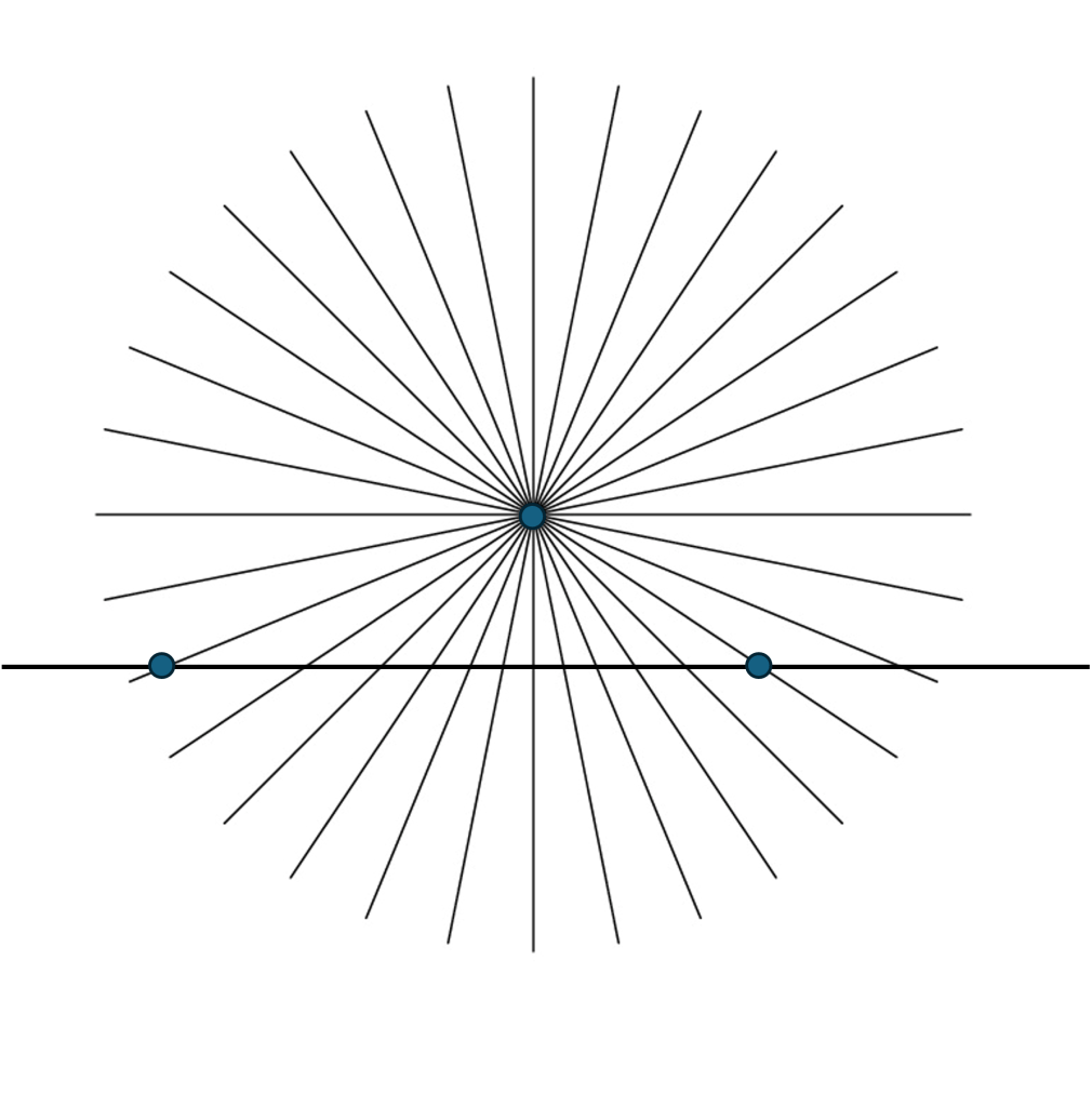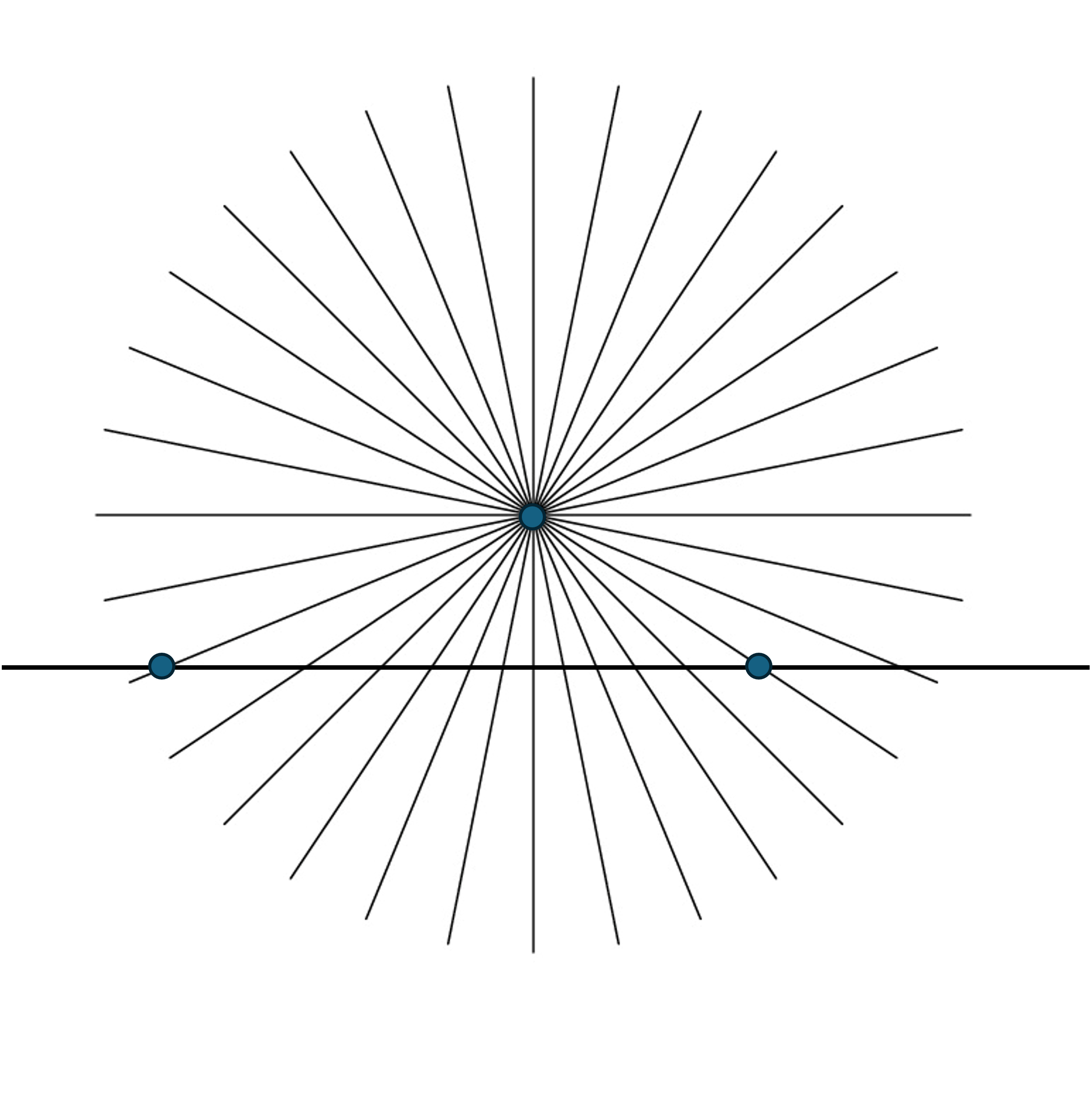 In order to expand the dimensions of space beyond this 1-dimensional space, we must assume that there is some point that is not in this space, a point that is not on the line. When we find a point that is not on the line, we can create a new line between any point on the line and the new point. This defines a new 1-dimensional space (a line) for every point on the original line, all of these new lines pass through the new point.