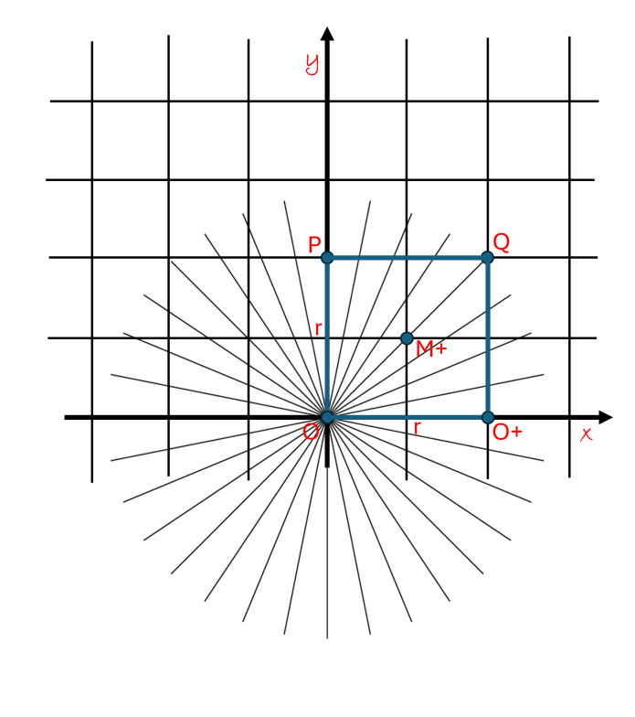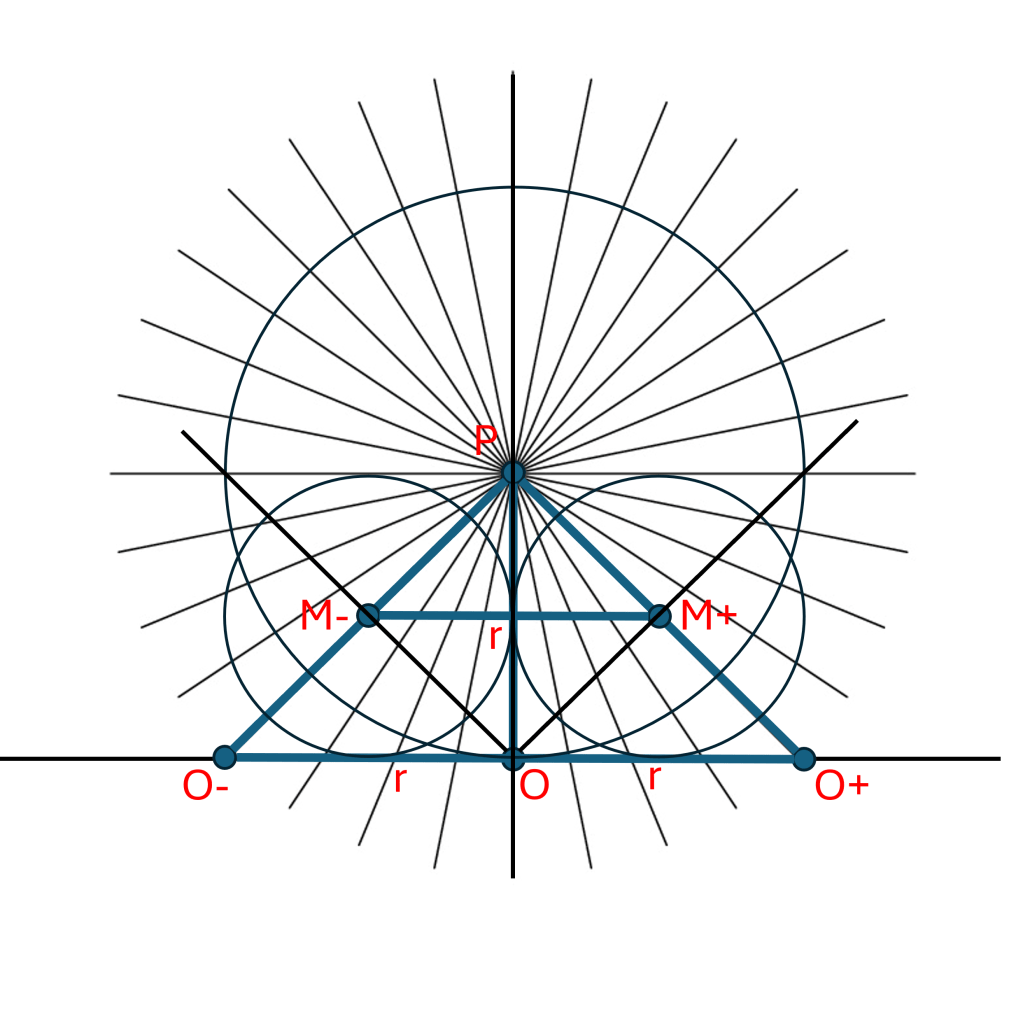 We call this new O-P direction the “z” axis.  Now imagine rotating this diagram around the z axis.  The O+ point would trace out a circle on the x-y plane, and touch every point on the plane that is a distance “r” from point O.  The distance from every one of these points on this circle would also be the same distance from P.  The segments P-O+ would sweep out the surface of a cone as we rotated the diagram around the z axis, and parallel lines would sweep out parallel planes along the z axis. We can rotate our sheet of paper around the z-axis to any angle and the cross section would still remain the same. Can you see it?