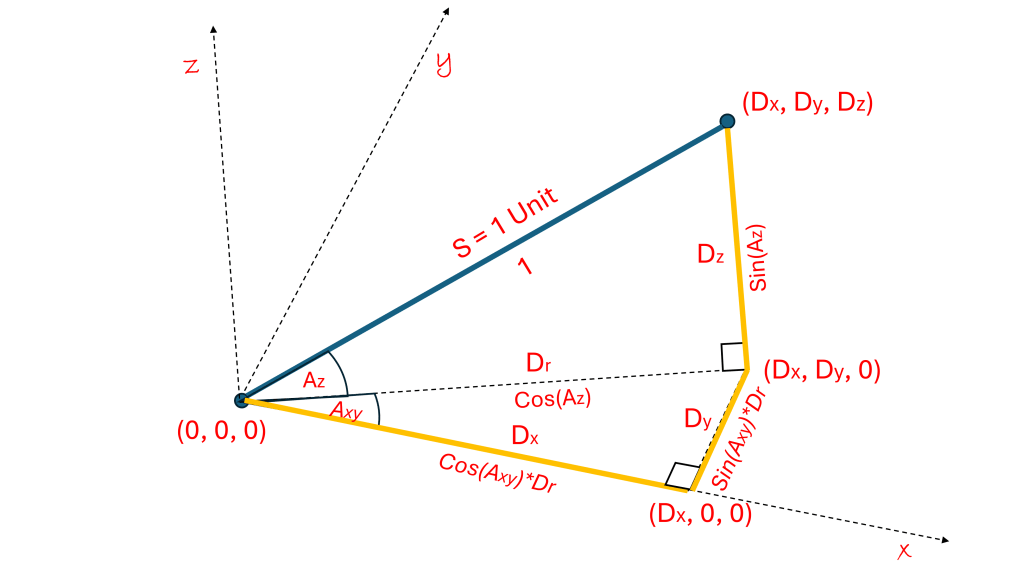 (Dx, Dy, Dz) = (Cos(Axy)*Cos(Az), Sin(Axy)*Cos(Az), Sin(Az))