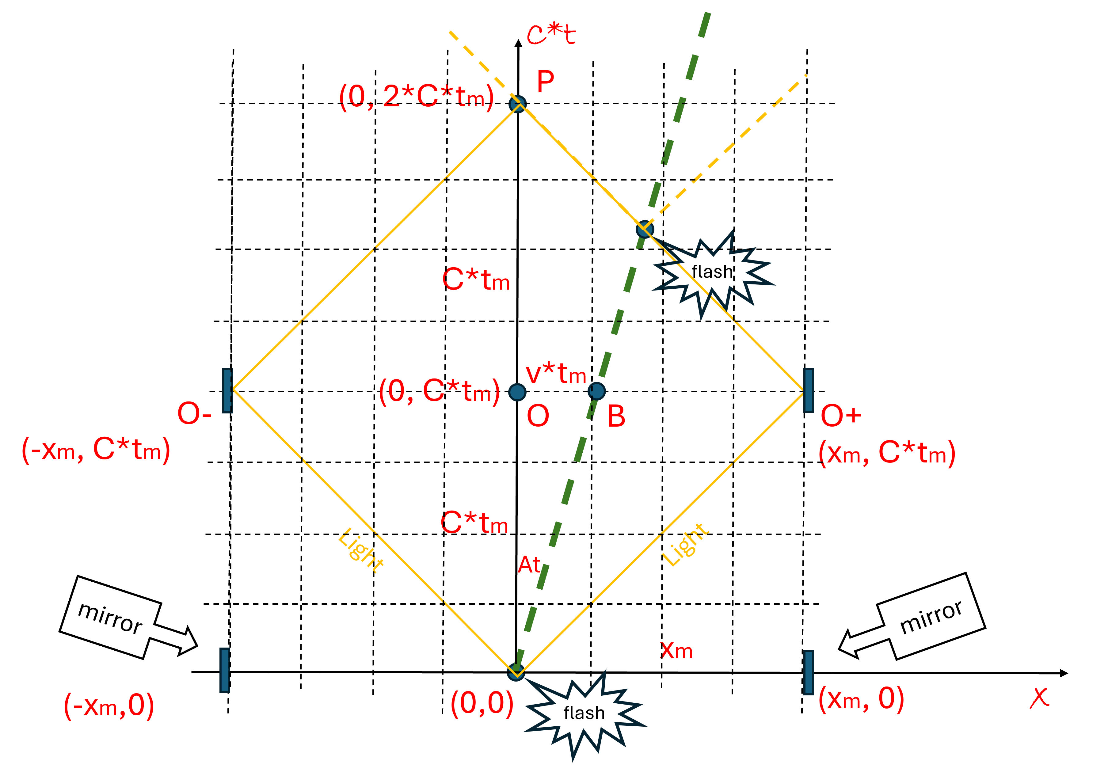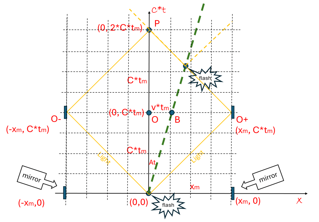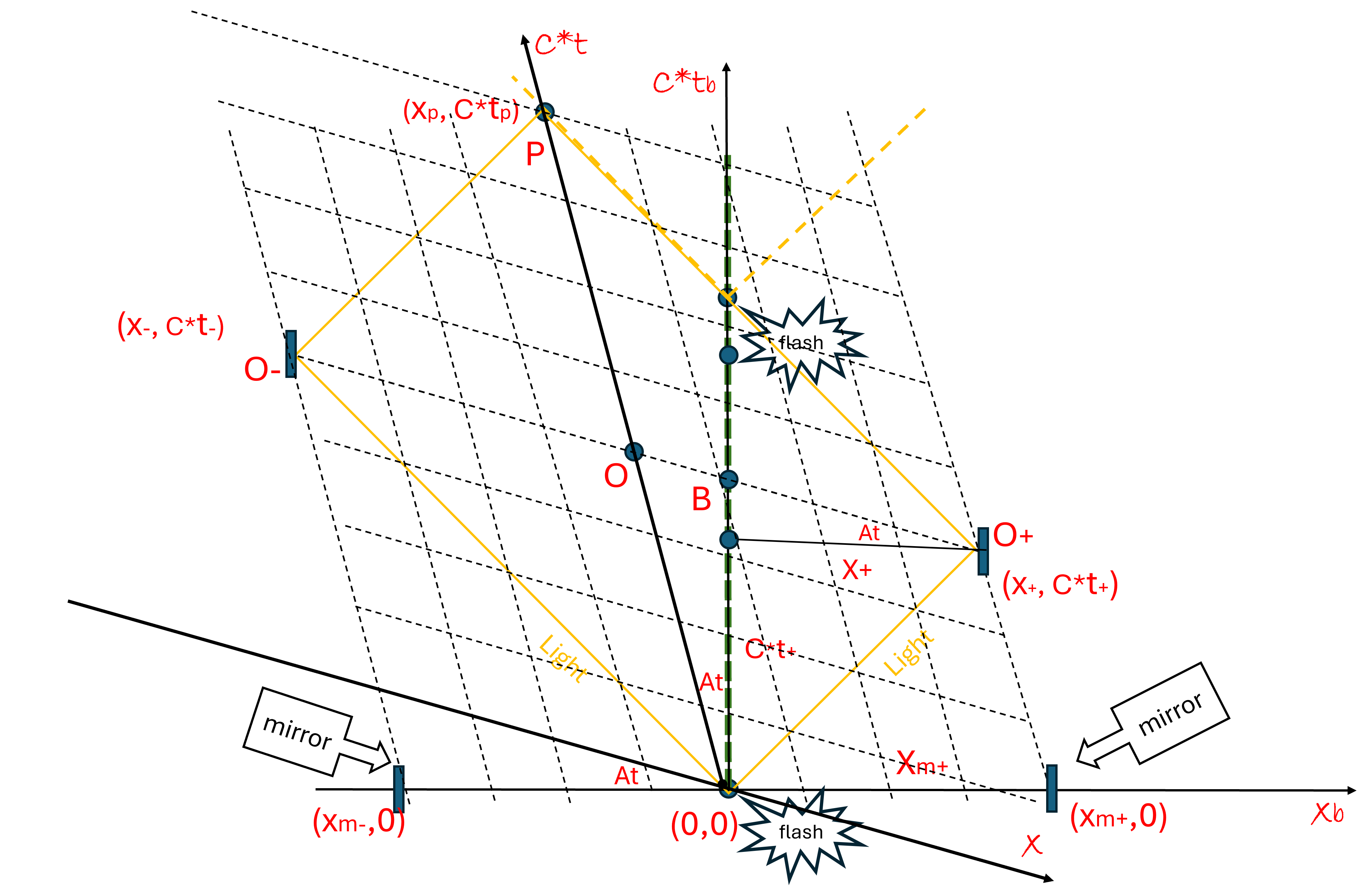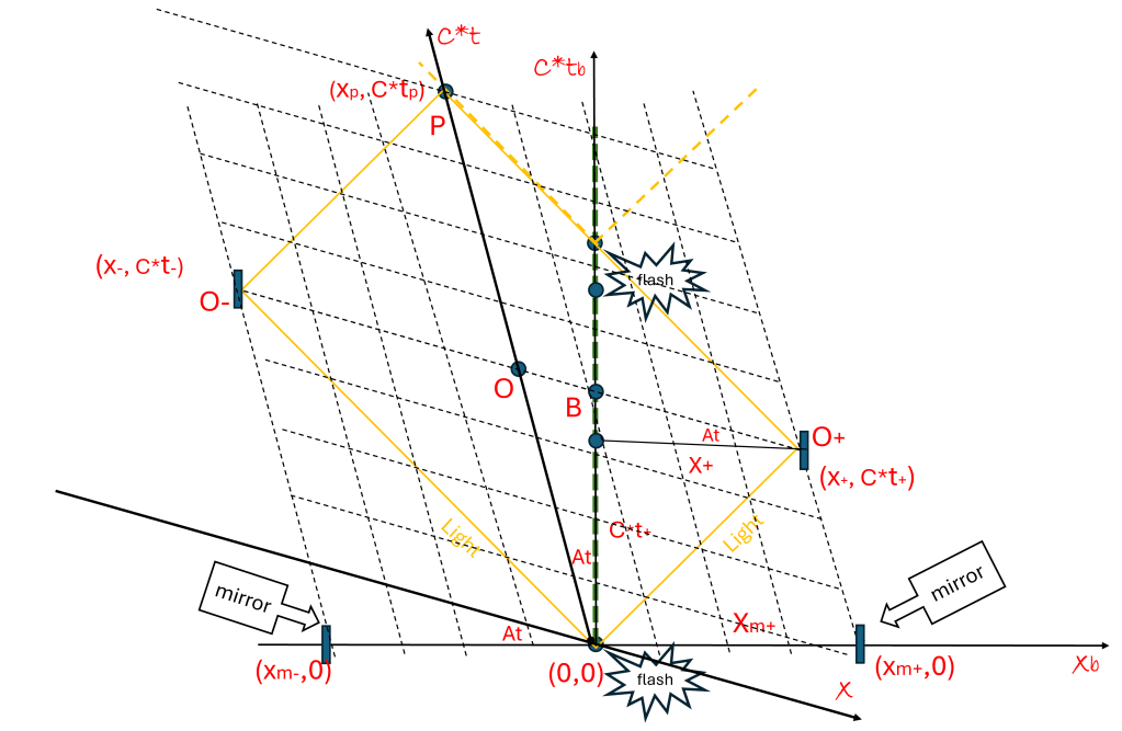 We can use the same concepts to find the meaning of Distance in Space-Time. Consider the example of a moving flash bulb (bulb frame) between two stationary mirrors (mirror frame) that we examined in the last post. For simplicity and clarity, we are only looking at the ‘x’ and ‘C*t’ dimensions and have put in grid lines parallel to the “x-axis” and “C*t-axis”. Here the x-axis points in the same direction that the bulb is moving.