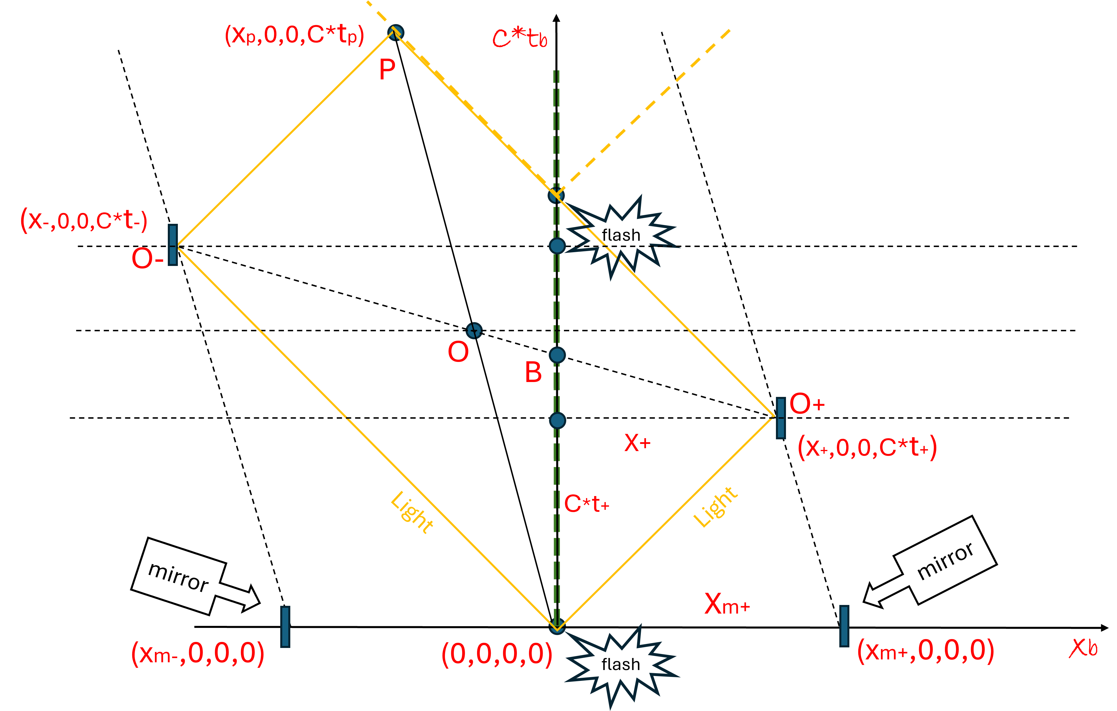 Where (Dx, Dt) marks the direction of the bulb world line in the mirror frame, and St is a distance marked along the C*tb-axis, and is yet to be determined. We can also find the equation of a point along the xb-axis in the mirror frame.