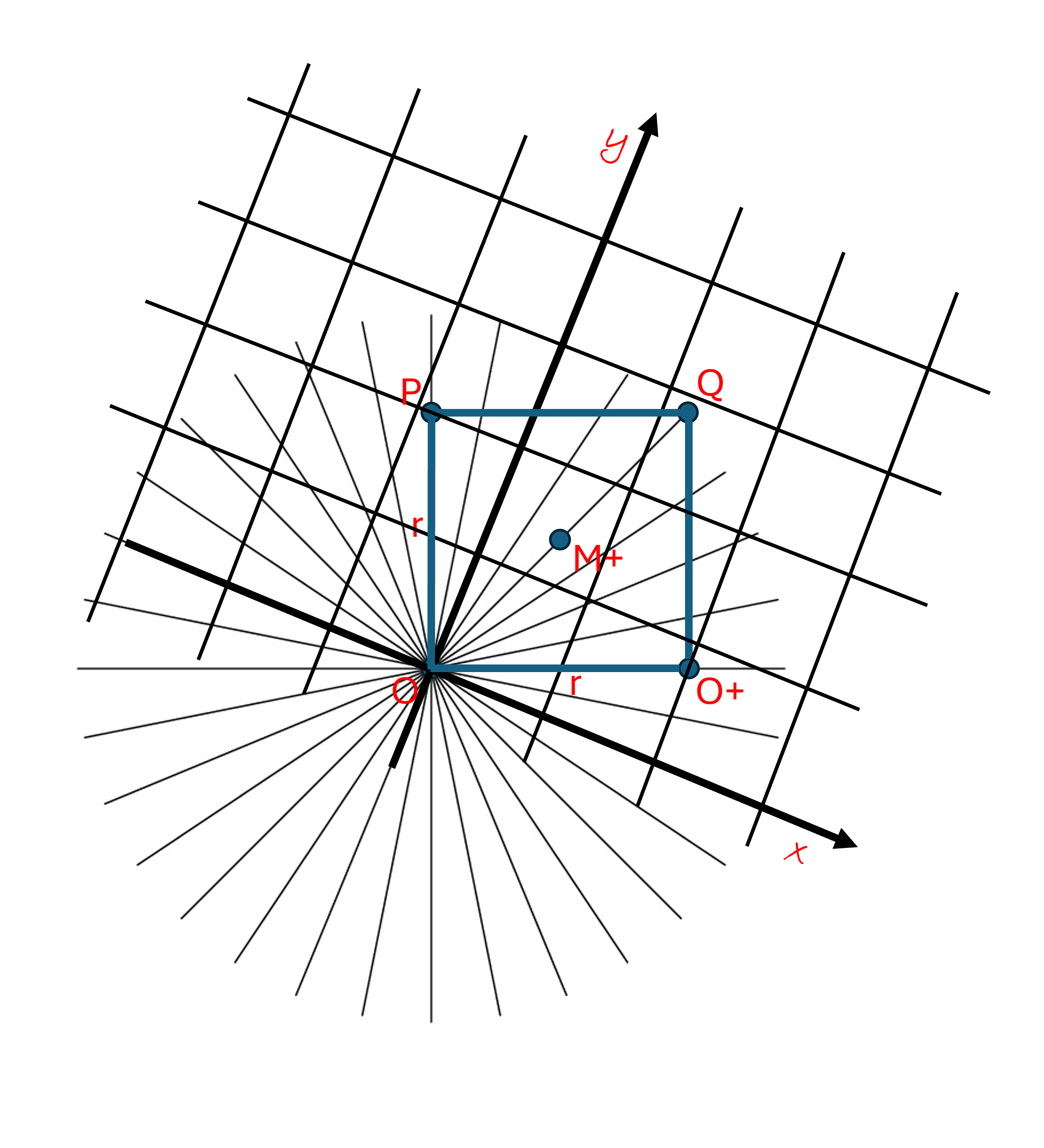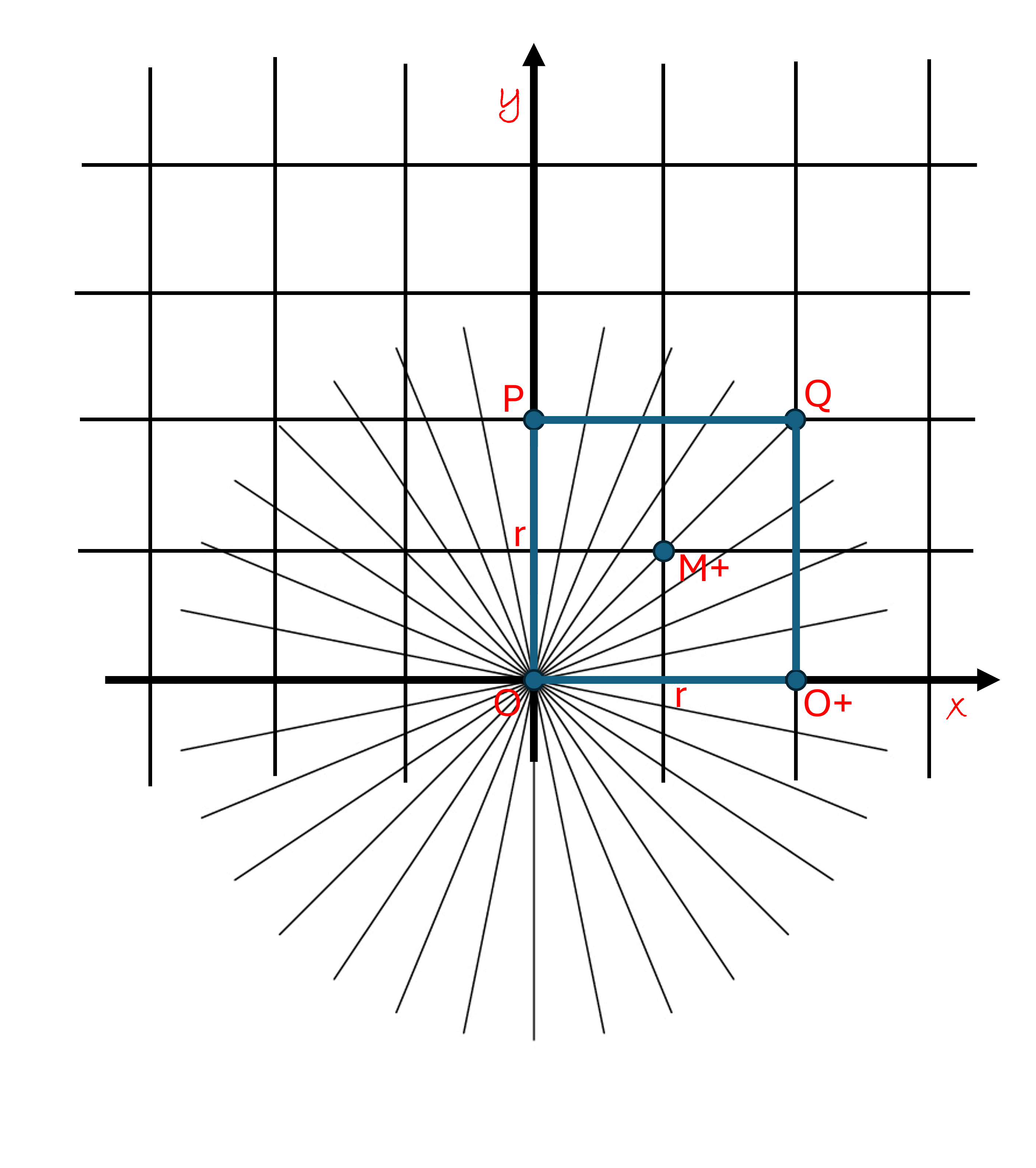 In the diagram, we form a square by taking the segment O O+ (of length r) and the perpendicular segment O P (also of length r) and reflecting them through M+ to form the opposite sides P Q and O+ Q. Note that we found a point Q that is exactly the distance “r” from both the “x” and the “y” axis. This square (in green) now has value, it is the real estate of 2-D space.