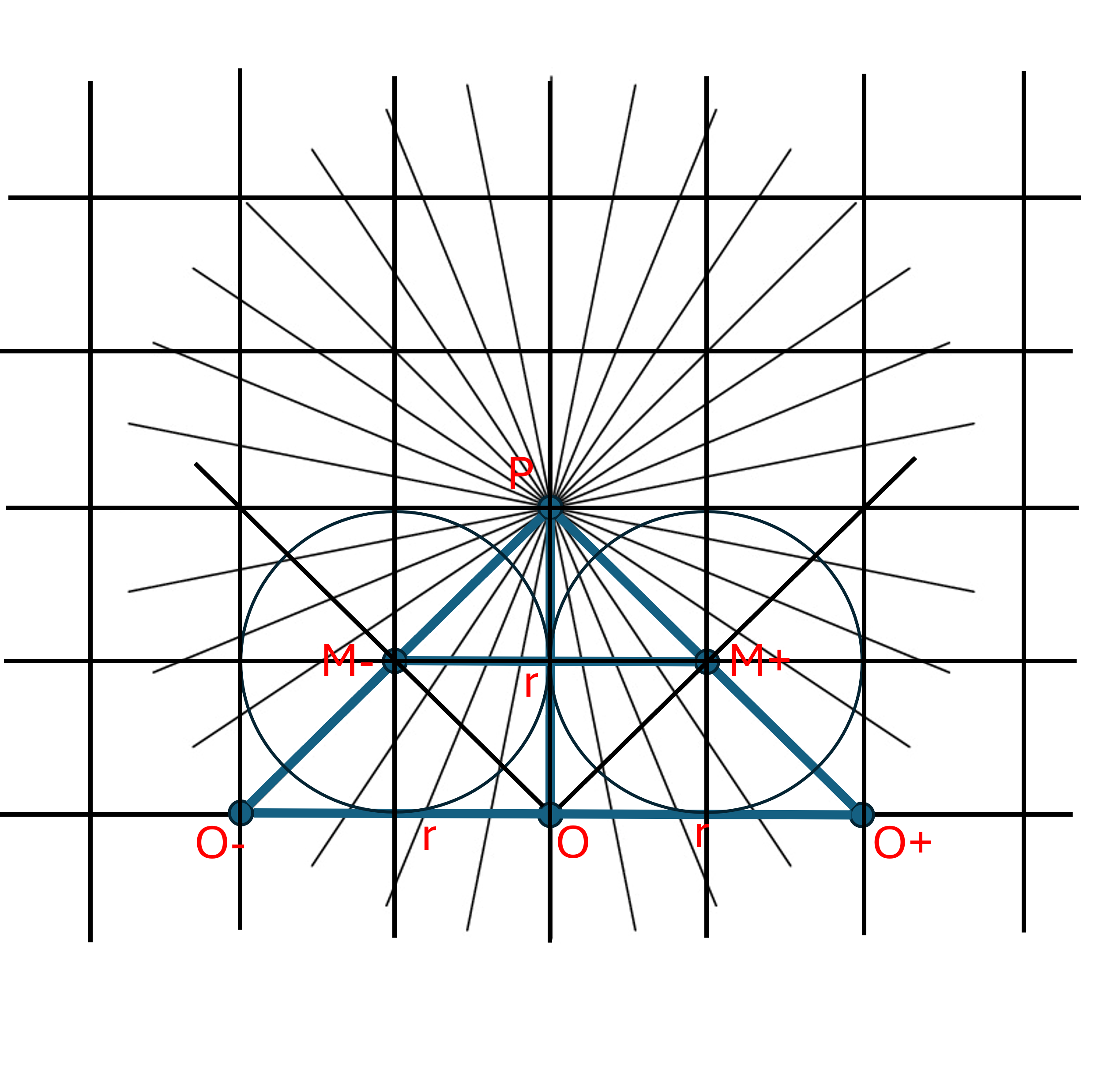 The diagram above shows what our 2-dimensional space looks like when we take the original line (through the points O- O+) and reflect it through the parallel line passing through the points M- M+ to form a reflected parallel line passing through point P. Then like parallel mirrors, we reflect these lines through each other. We can then keep on doing this, reflecting lines to get an infinite set of “horizontal” parallel lines with the same distance apart going on forever upwards and downwards.