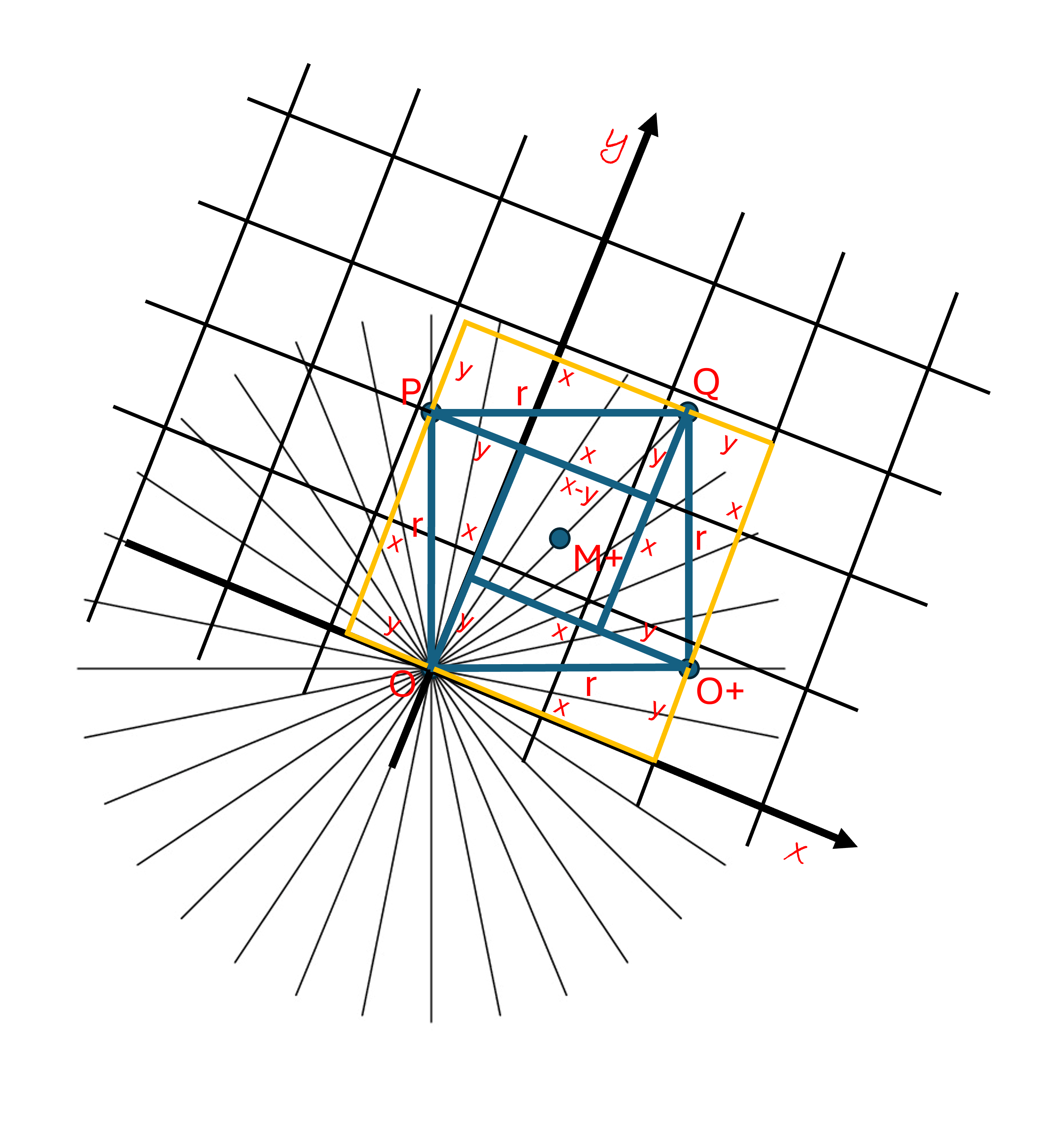 If I now choose the O+ point to be the point of reference and chose the “y” direction to be down and “x” direction to be to the left, as shown by the yellow script “x” and “y” in the diagram, I basically would have chosen to look at this same rectangle from an “upside down” perspective. By flipping the diagram upside down, you can see that the rectangle and O O+ line segment looks exactly the same from this perspective.