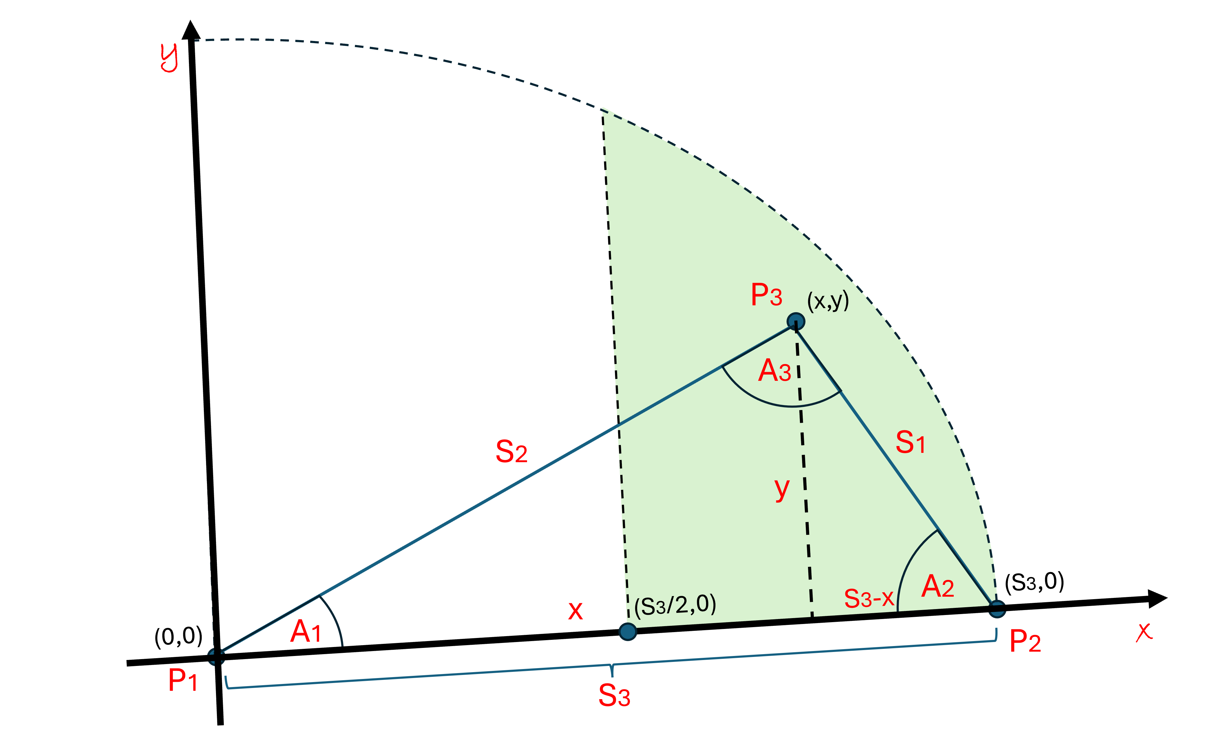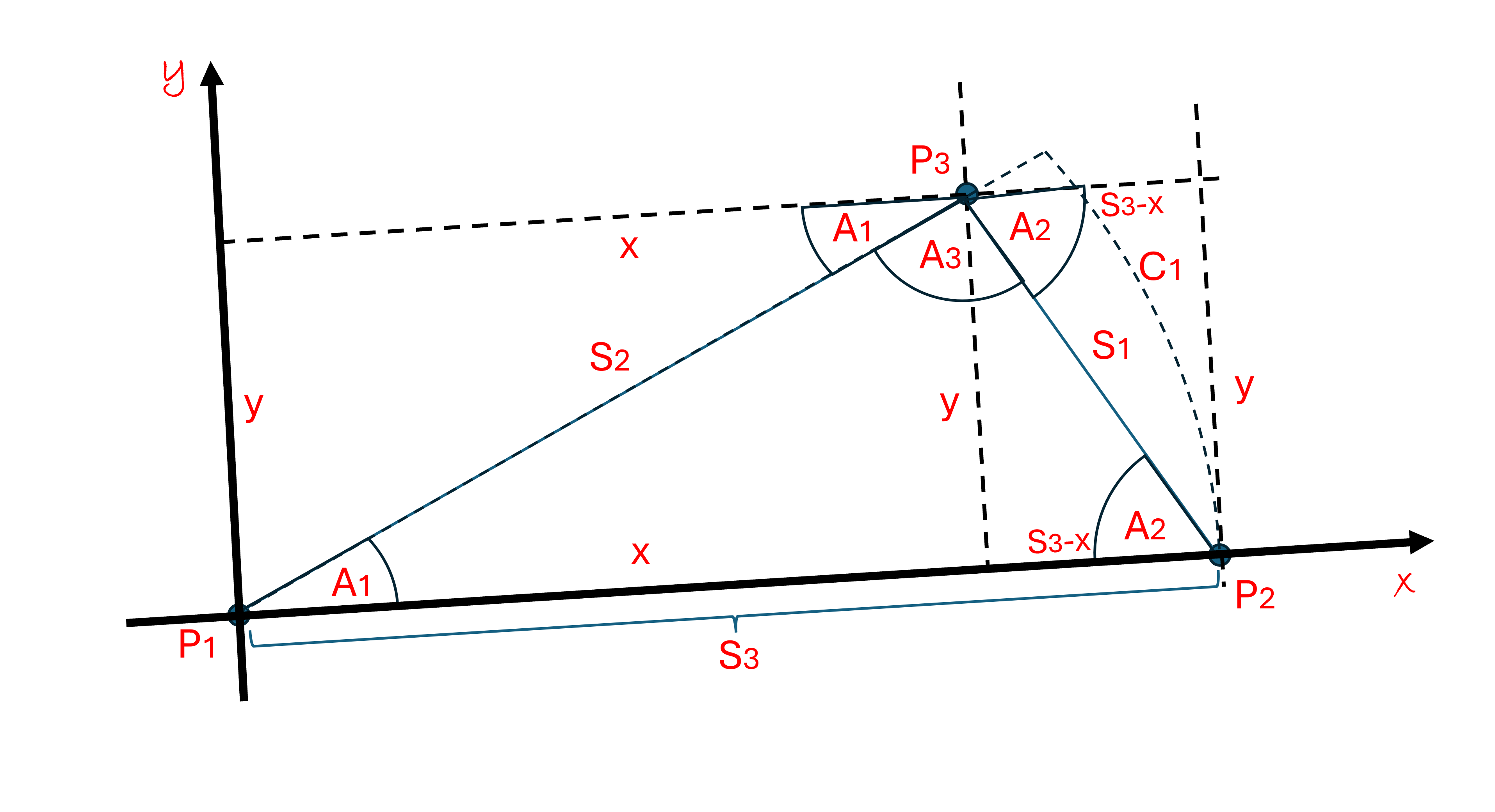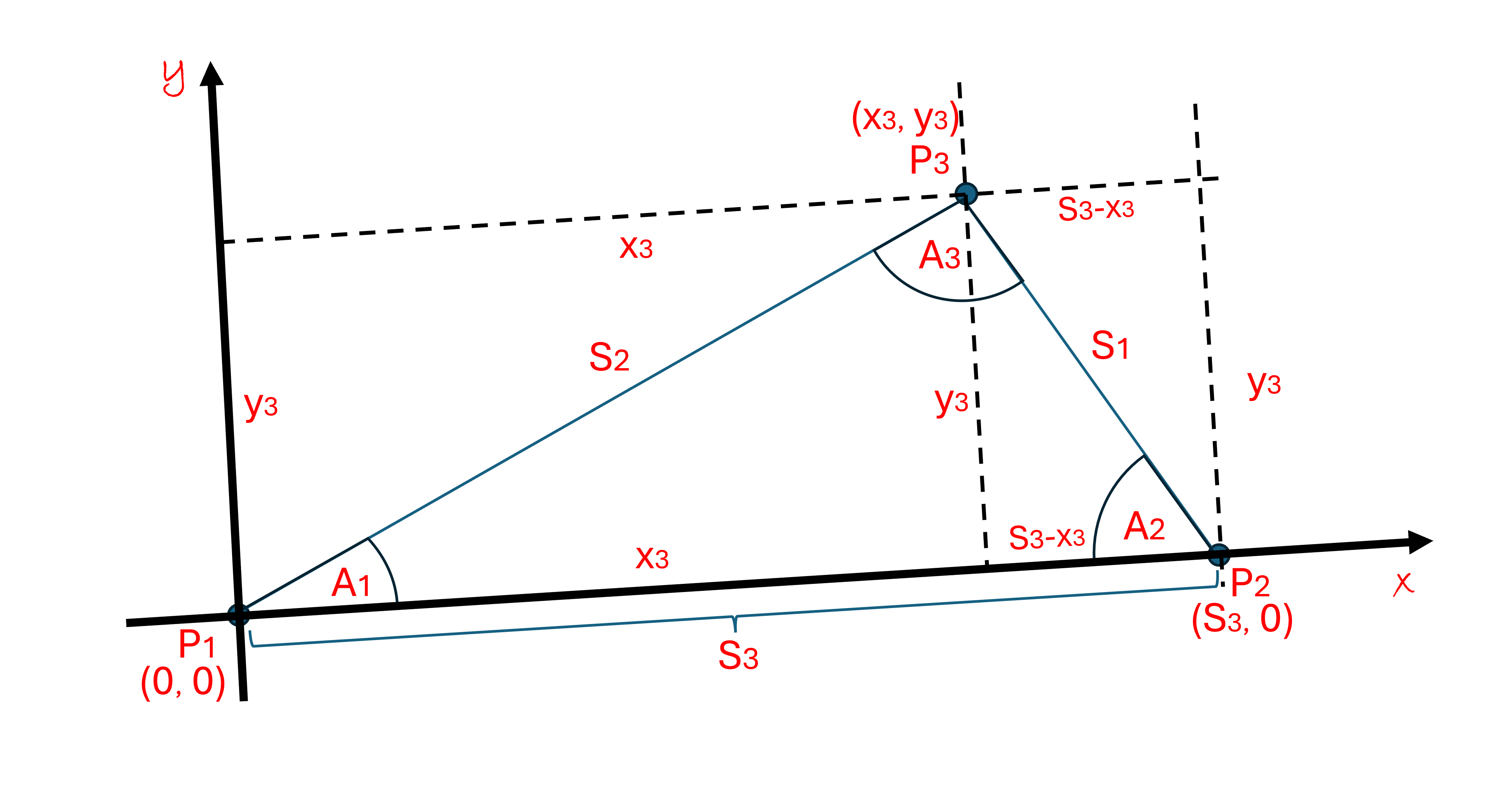If you choose P1 to be the reference point (the origin), then choose the “x” direction to point directly along the S3 side toward point P2, and pick the perpendicular “y” direction so that P3 is on the positive side. Then you placed this universal triangle on a grid as shown on the diagram above. P3 is the only point that does not lie on an axis. The distance of P3 from the y axis is labeled “x” and the distance of P3 from the x axis is labeled “y”, as shown in the diagram.