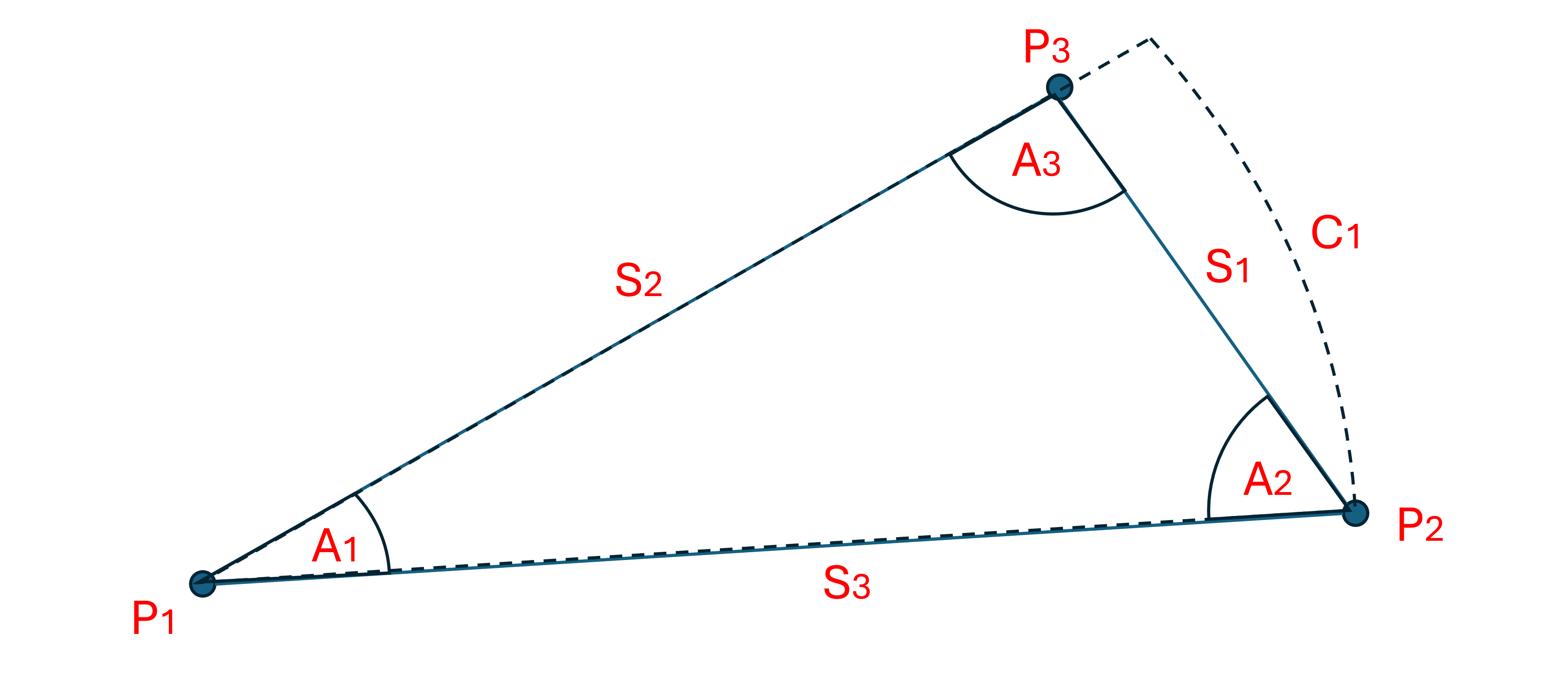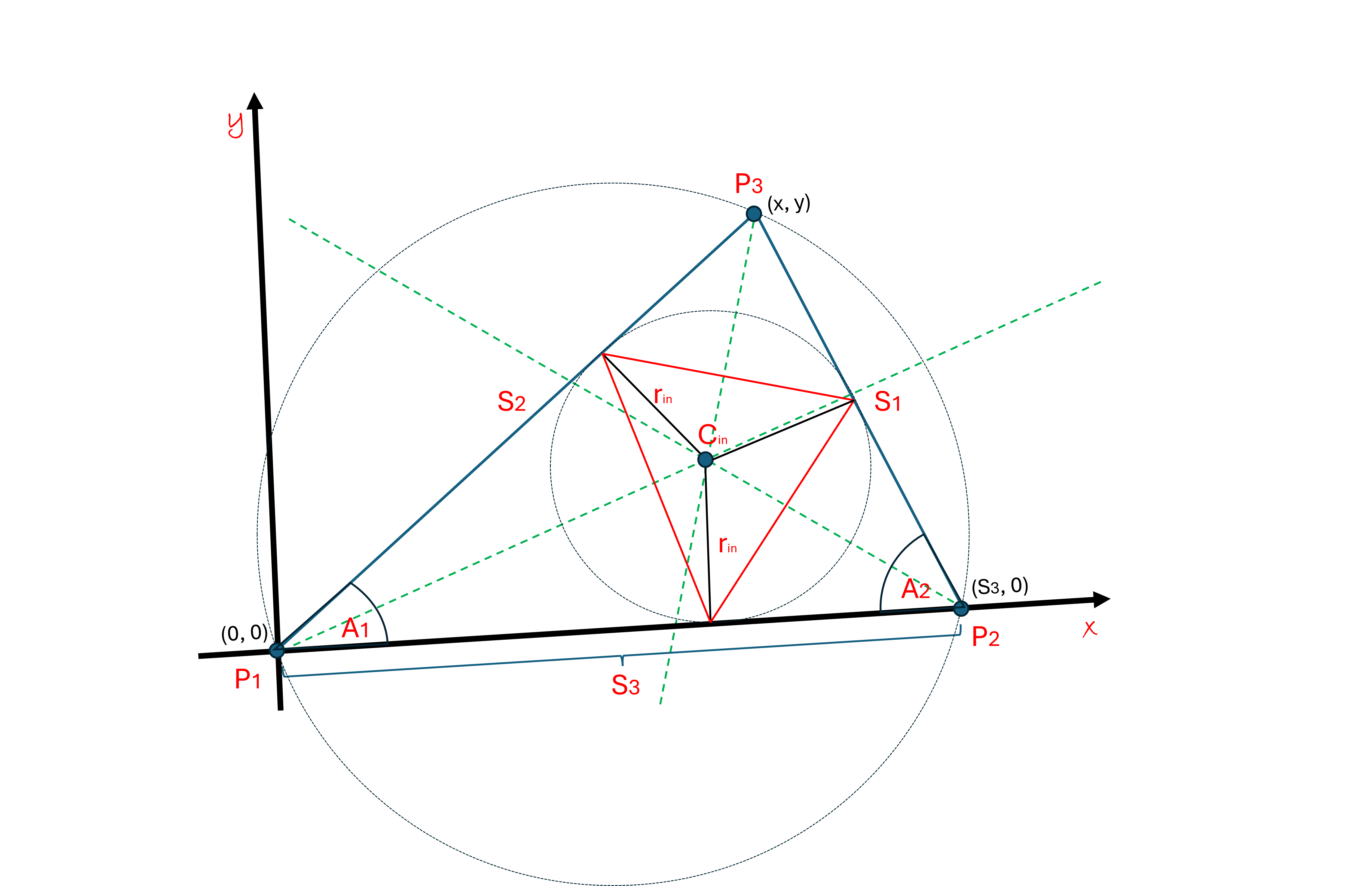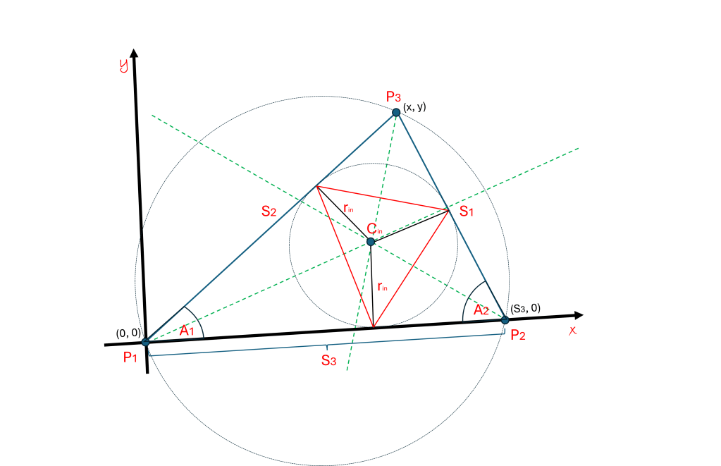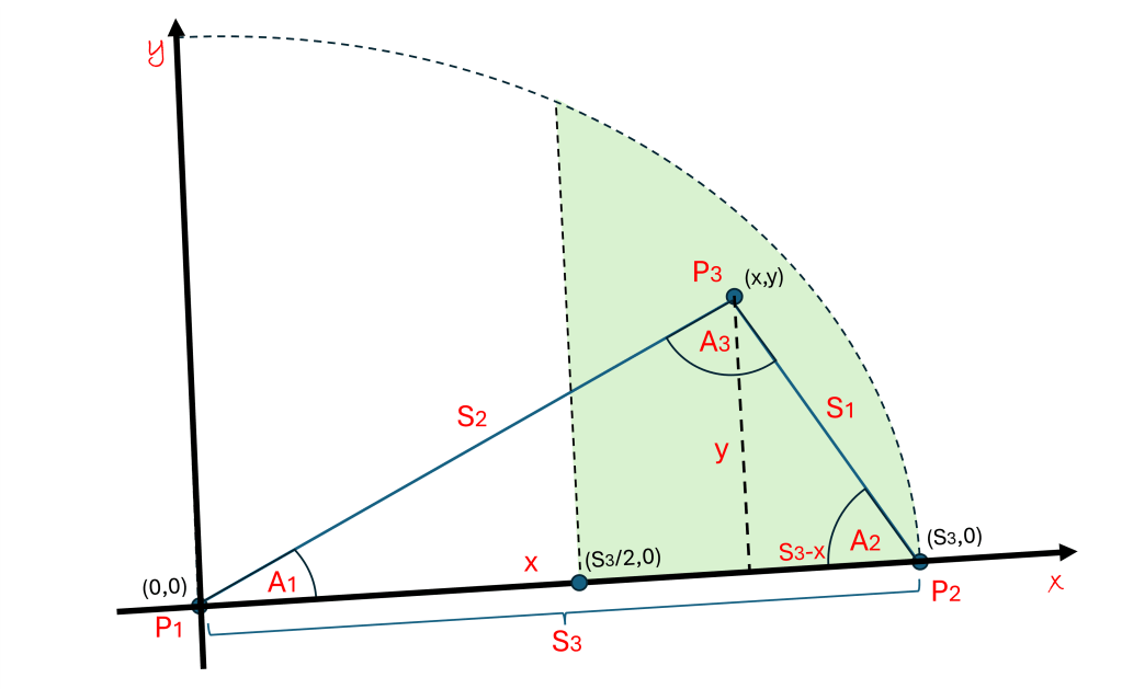 If you choose P1 to be the reference point (the origin), then choose the “x” direction to point directly along the S3 side toward point P2, and pick the perpendicular “y” direction so that P3 is on the positive side. Then you placed this universal triangle on a grid as shown on the diagram above. P3 is the only point that does not lie on an axis. The distance of P3 from the y axis is labeled “x” and the distance of P3 from the x axis is labeled “y”, as shown in the diagram.