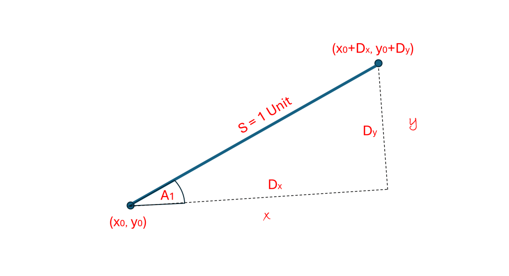 We will learn how to find the Dx, Dy direction parameters later. Notice that plugging S = 0 in the equations above sets the “pencil” at the starting point (x = x0, y = y0). When S = 1, the pencil has moved a distance of 1 unit away from the starting point, a distance Dx in the x-direction and a distance Dy in the y-direction. The pencil is now at the point (x = x0 + Dx, y = y0 + Dy), as seen when plugging S = 1 into equations. See the diagram above. Since the “pencil” has moved a total distance of 1 unit in total, we know from the Pythagorean theorem that: