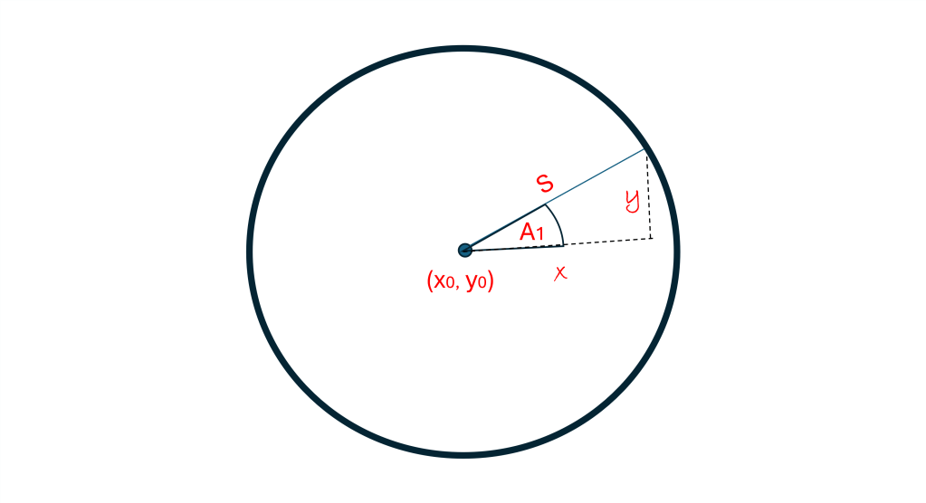 The equations above will also draw circles. If you keep the distance (S) constant and vary the angle (A1) from 0 to 360 degrees, the (x, y) “pencil” will sweep out all the points on a circle that are a radius S away from the center (x0, y0). This is an extra bonus.