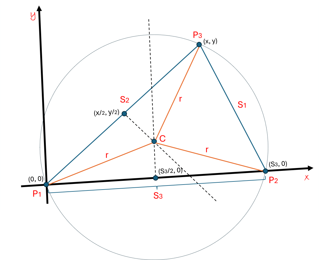 To show this, we start by recalling the wonders of reflection symmetry. The midpoint of S3 between P1 and P2 is the same distance from both these end points. We can find all the points that are the same distance away from P1 and P2 by drawing a perpendicular line of reflection through the midpoint of S3. We saw that this is the line where x = ½ * S3. Any point on this vertical line is the same distance away from P1 as it is from P2. This is shown by the vertical dashed line in the diagram above. In the same fashion, the points that are the same distance from P1 as they are from P3 are found to be along the line of reflection that cuts the segment S2 in half, as is shown by the other dashed line on the diagram. These two midpoint lines of reflection from S3 and S2 meet at the “center point” C. And so, we see that this point C is the same distance “r” from P1, P2, and P3. We can draw a circle with center C and radius r that connects all three of these points, as shown in the diagram above.