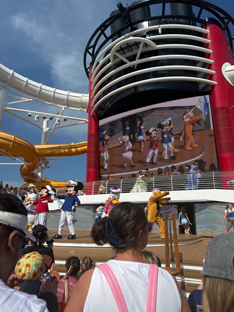 The party was on the main deck, with literally thousands of people standing and swaying while Disney Characters, and dancers, put on a spectacular show, backed up by music and scenes on the jumbotron. We met the rest of our family there, put the grandkids up on our shoulders to watch. The captain’s steward came out, there was a countdown, when it reached zero the ships horns blasted the “When you wish upon a star” theme and we were off. The departure was so smooth that no one could even feel us start moving and I didn’t even know we were moving until later when we looked out of our large round stateroom window into the vast ocean moving by.