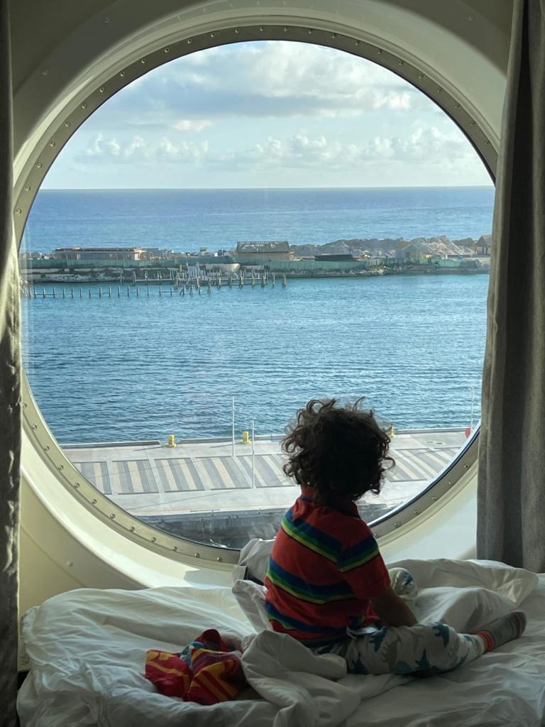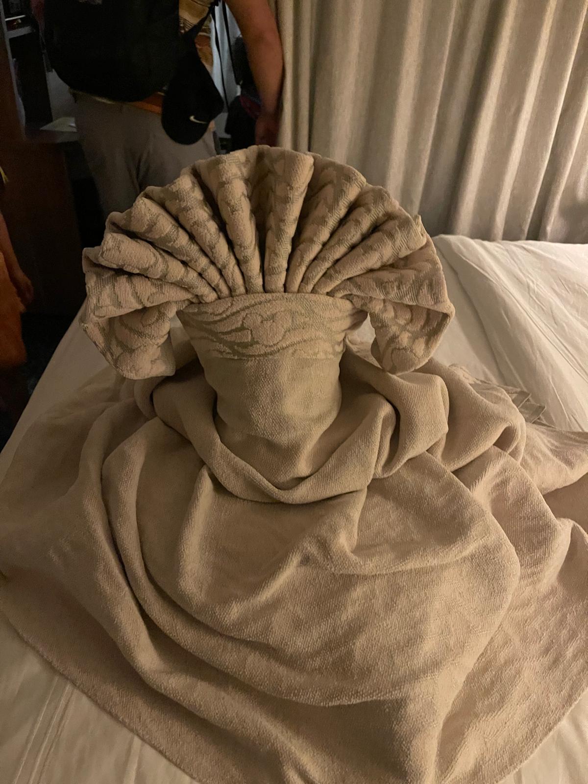 The food servers knew our names, carefully memorized our preferences, and playfully interacted with our grandchildren throughout the whole meal. We found out later that while Ant Man was mistakenly “shrinking our ship” during the show, a huge storm was actually raging outside, with golf-ball-sized hail pounding down on the main deck. The ship just brushed it off, without a scratch. We felt absolutely nothing inside, all felt rock solid, we could barely hear the hail hitting our stateroom window. What we did notice, however, is that the staff had prepared our stateroom, they put up bunk beds for the grandchildren, a murphy bed for our son, and had made up our bed with beautiful towel art and chocolates. The beds were very comfortable. We slept like babies all night long.