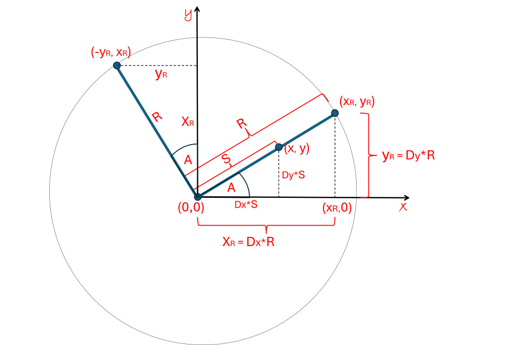 Now we do something really interesting. Suppose that we are still at the origin, facing directly at the point (xR, yR) but we want to find the point on the circle that is exactly 90 degrees to our left. If you look at the diagram, you will easily see that the point of destination would then be (-yR, xR). The point directly behind us would be (-xR, -yR) and the point 90 degrees to the right would be (yR, -xR).